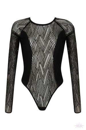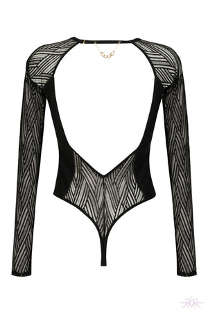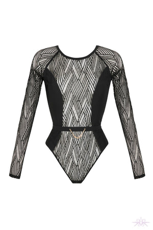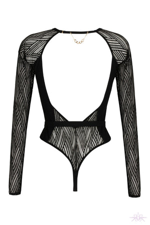 A beautiful long sleeve bodysuit in graphic lace from Atelier Amour. The gorgeous mesh is both elegant and seductive with a fully open back for a sensual cut and the belt is decorated with a gold chain which is removable and adjustable. It can be worn on top or underneath, with or without the belt.