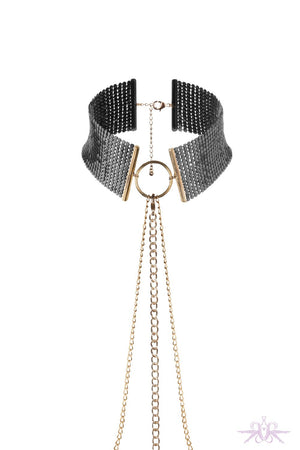 Unleash your imagination and surrender to pleasure! Easy task with this adjustable metallic black choker. Its cool metal chains that drapes the torso and around your waist highlight your curves. An easy-to-wear collar for any occasion and a suggestive bedroom accessory for soft bondage games. Do you dare?