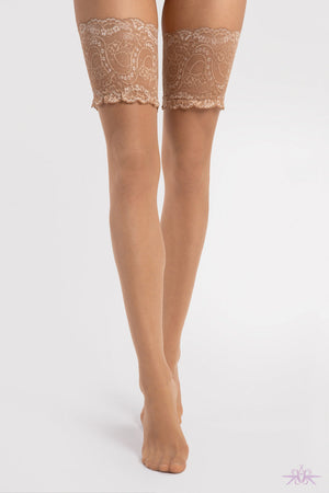 A sensual hold up with a seductive lace top, sheer leg and invisibly reinforced toe for elegance and sophistication. They are made from a single-covered elastane yarn for durability.