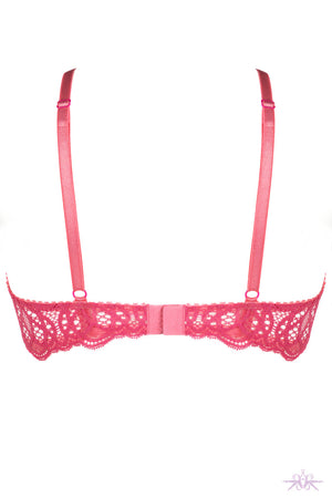 A seductive underwired sheer mesh pink bra from the Angels collection at Jolidon. This pink lace bra is so glamorous with its sheer floral mesh detailing and cut out opening between the bust. It is underwired which enhances the bust beautifully and the elastic strapping to the neck and shoulders is comfortable creating an alluring piece of lingerie. Matching items are also available.