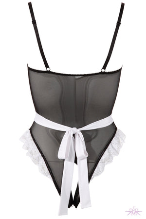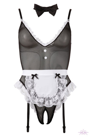 Elevate your seductive service with the Maid Sheer Suspender BodySuit, crafted from sheer powernet and adorned with delicate lace. Featuring adjustable straps and removable suspender straps, this crotchless design offers both comfort and allure. Complete with a playful collar, bow tie, and a tie-up apron, it’s the perfect outfit to captivate and tease with confidence.