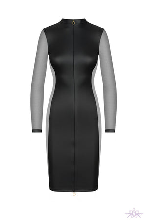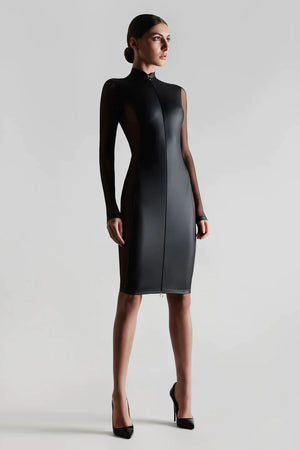 A luxurious matte leather effect and sheer tulle dress with front and back-opening and long sleeves. There are sensual graphic cut-outs on the tulle to show off the arms and reveal the side of the body. It opens at the front and at the back with two two-way zips with a golden ring trim.