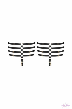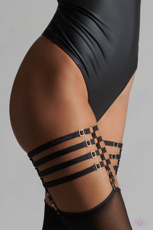 Seductive garters from the Chambre Noire collection by Maison Close. A jewellery-accented accessory to subtly accentuate your nudity with clusters of fine gold rings and elastic ribbons. Adjustable for all body shapes.