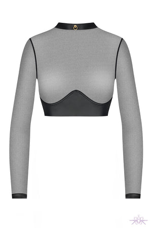 A gorgeous matte leather effect and sheer tulle long-sleeved top from the Chambre Noire collection at Maison Close. It opens with a zip with a golden ornamental trim at the back and has an adjustable fastener on the nape of the neck. An under band provides maximum support and the bust and bra is covered in contrasting transparent tulle. There is leather effect trim on the cuffs.