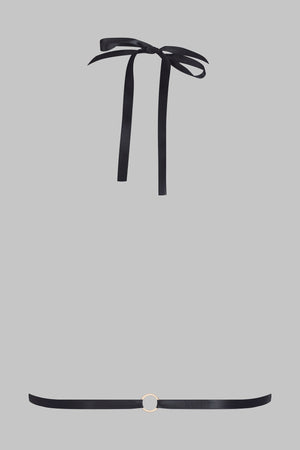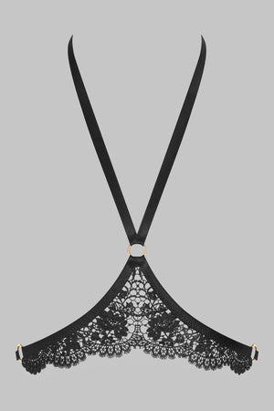 Harness made of fine guipure that wraps around the neck and under the bust. It's like jewellery against the skin, adorning and accentuating the cleavage. Wear on its own or with something from your wardrobe. Delicate satin ribbons that can be adjusted at the back with fine gold accessories and tied at the neck or left untied, to suit you.