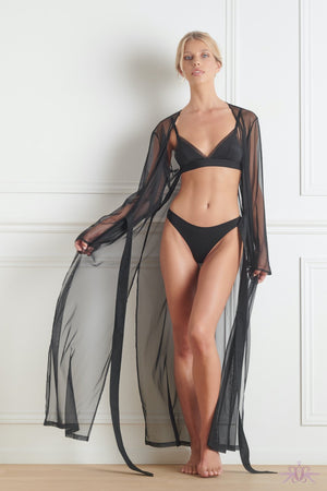 A beautiful triangle bra adorned with a gorgeous tulle ruffle from the Madame Reve collection. This bra hugs the breasts and creates a natural curve. Under the bust is a band of elastic which provides support and its straps are adjusted thanks to the discreet gold jewels. Wear with the matching brief and long kimono for that look of elegance and sophistication.