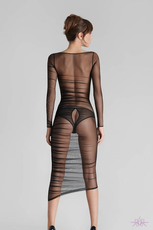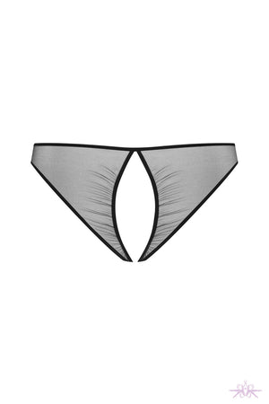 A black bi-material open panty from the Nuit Fauve collection at Maison close. The transparent pleated tulle of this panty to the rear along with the back opening make it a seductive piece. It is delicately trimmed with opaque material to give structure and support. The front is opaque. Match it with the long sleeved top or under a dress.