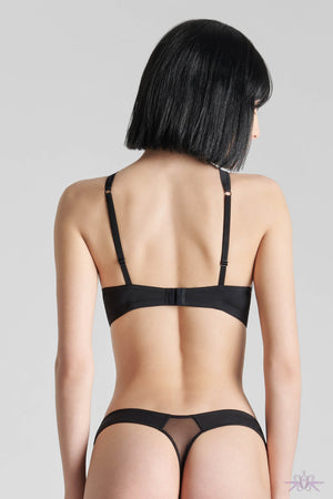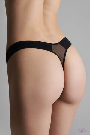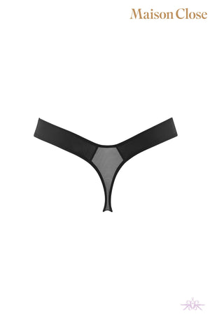 A Seductive black thong featuring a high cut leg which sits high on the hips. It is part of the Pure Tentation collection from Maison Close in France. This sheer thong is made from stretch mesh and creates leg lengthening power.