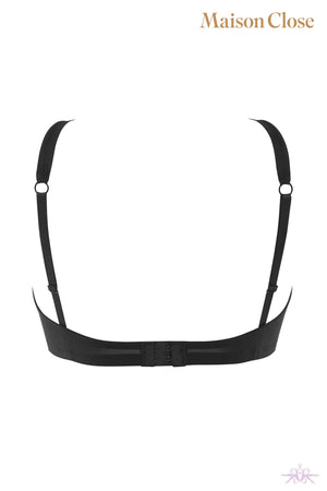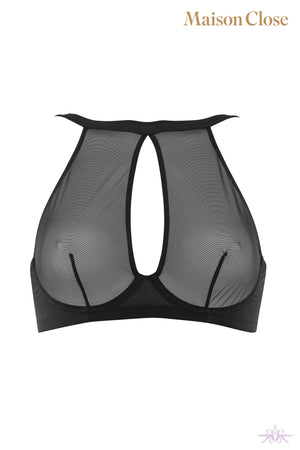 A luxurious high necked styled bra made with smooth sheer mesh cups. Maison Close have produced a stunning underwire bra in black for a defined framing effect.