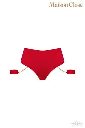 A sexy high waist thong from Maison Close. This red thong is part of the Tapage Nocturne collection and is crafted from super soft microfibre. It has a gorgeous seductive peekaboo cut to the back which allows the gusset to be opened. This style flatters your curves and the gold tone cuffs are detachable. Matching triangle bra is available.