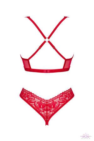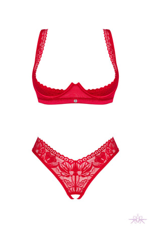 A fiery red open set from Obsessive with an extremely tempting cupless bra and crotchless thong. A perfectly seductive combination. The bra is underwired so it will enhance and emphasise the bust.