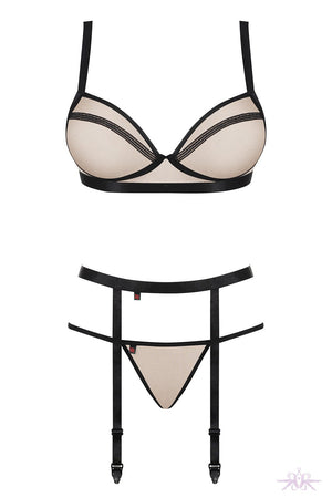 A sensual, nude set with shimmering thread from Obsessive is the perfect solution for those women who like delicate fabrics and a fantastic accent in the form of straps. The bra emulates a wired look but with elastic. The sheer nude cups highlight the bust with wide adjustable straps. The garter belt is delicate black elastic straps with four adjustable suspender clips.