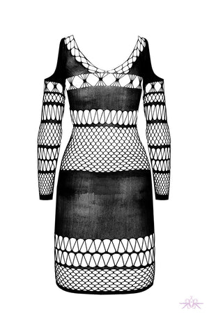 A seductive short fishnet dress that fits the figure and emphasizes the feminine shape. Beautiful lace detail and an open lattice to the chest makes this dress a perfect choice for the boudoir.