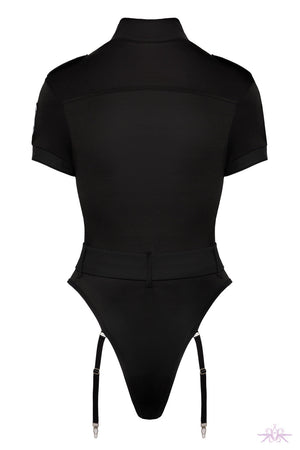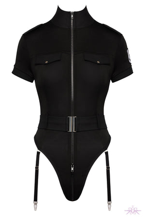 Embrace a bold, commanding presence with this Police Suspender BodySuit. Crafted from a soft stretch blend combining matte and shiny wetlook, it features a high-neck, half-sleeves, and shoulder flaps for an authentic police vibe. The eye-catching emblem on the left arm and adjustable, removable suspenders add striking detail. A full-length 3-way zip from collar to crotch and a stretch belt with a silver buckle complete this daring, confident look.