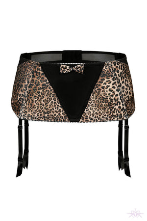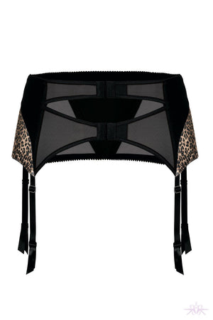 A gorgeous suspender belt that features a black v shape panel at the front and a subtle glitter finish over the leopard print detailing. The back of the suspender belt has cut out sheer black fabric detailing and two adjustable parallel hook and eye fastenings. The boning to the front and rear add support and accentuate the feminine curves. The suspender straps are adjustable and finished with ribboning at the ends and metal rubber suspender clasps. Combine with the matching bra and thong for a seductive look.