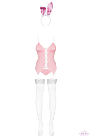 Be daring with The Bunny Outfit in Baby Pink. This charming costume features adjustable straps and a seductive design for a sexy look. With cute bows and seductive slits, you'll feel irresistible. The corset lacing and adjustable garters ensure a perfect fit, while the soft, elastic fabrics provide comfort. This playful bunny outfit includes a top with garters, panties with a bunny tail, stockings, and ears.