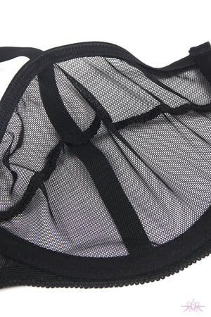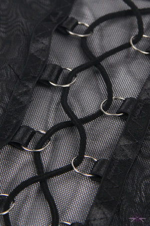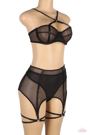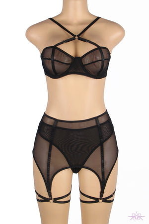 Experience the thrill of risk-taking with the YesX Three Piece Bra Set. This elegant yet seductive set features a black mesh bra with garter lace-up details for a flattering, alluring look. The matching garter belt offers a customizable fit with lace up fit to the rear and the included thong adds to the sensual appeal. Complete your daring look with the unique touch of the leg rings.