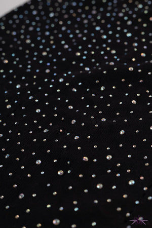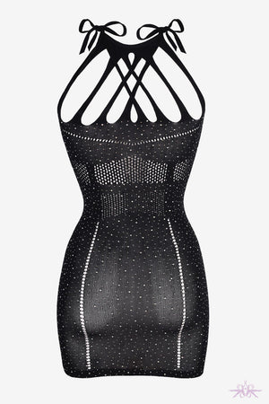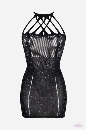 A seductive elastic fitted mini dress made of a soft mesh material that will excite the senses. It is tied at the back of the neck and has a decorative neckline. There are shiny crystals adorned front and rear that glimmer as you move.