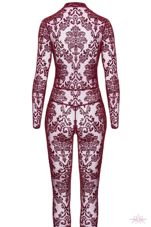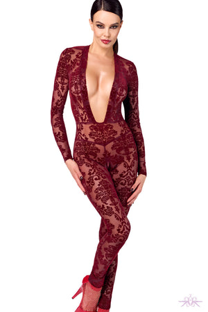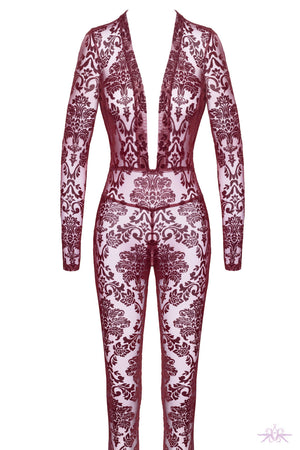 This Noir Handmade Kink Royal Catsuit boldly combines elegance with provocative flair. Made from luxurious burgundy flocked tulle, it offers a unique blend of sheer softness and velvety texture that captivates from every angle. Its deep plunging neckline highlights the décolletage, while long sleeves and full-length legs sculpt a sleek, elongated silhouette. A discreet crotch zipper ensures practicality without compromising its daring design. Perfect for those who want to command attention and express confidence with every wear.