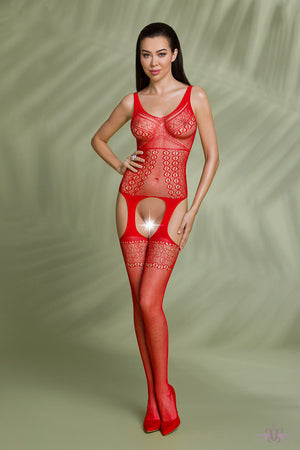 Enhance your figure and embrace your femininity with the Passion Eco Melissa Red Crotchless Bodystocking. Made of high-quality recycled materials, this sexy bodystocking is designed to fit perfectly and flatter your curves. Available in one universal size for your convenience. Go green and feel confident in this sustainable and alluring piece.