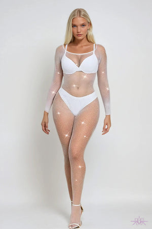 Unleash your inner risk-taker in the YesX White Sparkle Fishnet Bodystocking. This daring piece features stretchy, sheer fabric that hugs your curves and catches the light with sparkling diamante accents. The crotchless design adds a daring edge, while the long sleeves add sophistication.