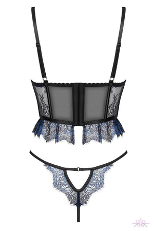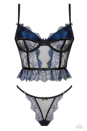 Romantic lingerie set featuring a short corset top and matching pants. It is made from black tulle and metallic sparkle sapphire lace. The corset is boned in and below the cups for support. There are adjustable straps and a hook and eye closure for a secure and flattering fit.
