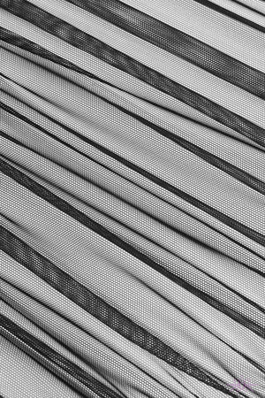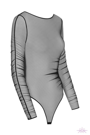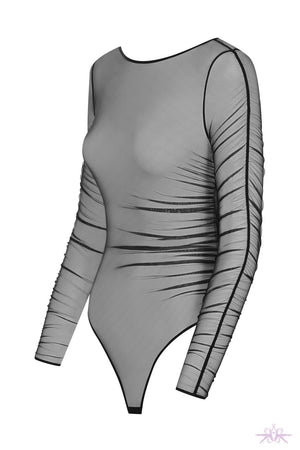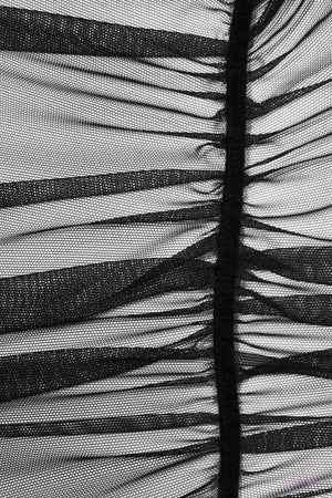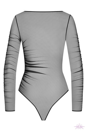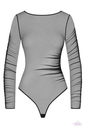 A decadent seductive high-cut thong bodysuit in transparent tulle from Maison Close. The pleated seams enhance the silhouette whilst the long delicately pleated sleeves give a tiger effect. Adjustable closure with a smooth and fine hook at the crotch.