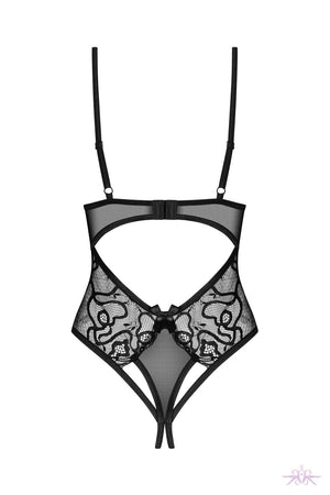 Indulge in your desires with the Obsessive Blomentis open bodysuit. Made with delicate lace and transparent fabric, this black body will hug your figure perfectly. Featuring a deep neckline and open crotch, it adds a touch of flirtatiousness to your ensemble.