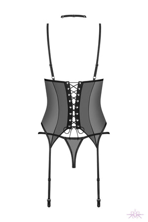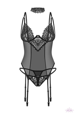 A sheer black corset made of stretch tulle with elaborate embroidery inserts from Obsessive. This three piece set includes a thong and a choker and is soft all round for comfort. The underwired cups accentuate and support the bust with lacing to the rear. The thong seduces with stylish stretch sides and the adjustable, tight fitting choker completes the seductive look.
