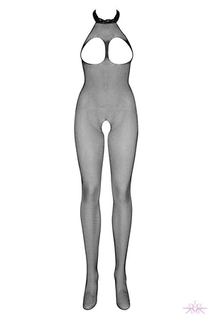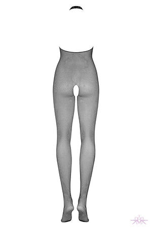 A sheer halter bodystocking with open bust and crotch. The seamless bodystocking is fashionable and luxurious to wear. It clings to your figure and gives a body a sensual and alluring shape.