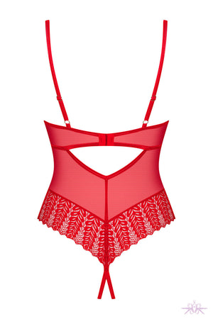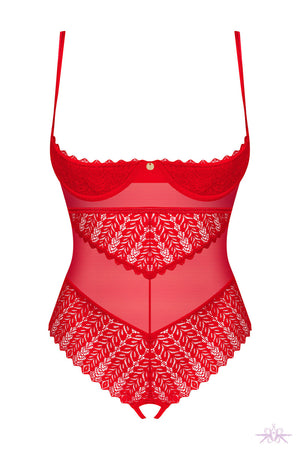 A gorgeous seductive red open bodysuit from Obsessive. It beautifully shapes the figure and has open cups and crotch. The cups are underwired and slightly padded giving support to the bust and the shoulder straps are adjustable for a comfortable fit.