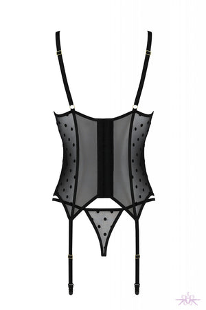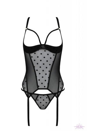 A beautiful corset in transparent tulle with a dot design. It has seductive open cups which are underwired for support and there are four adjustable suspender straps to hold your stockings in place. The corset has adjustable shoulder straps and is fastened at the rear with hook and eye fastening.