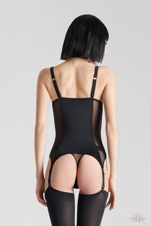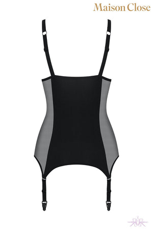 A tantalising naked breast bodice from Maison Close. This half sheer tulle and half soft microfibre bodice is the perfect balance of two delicate fabrics. The bodice features a naked breast though daring has support due to its underwire. Its wide and adjustable straps guarantee a perfect fit. There are four wide suspender straps which allow you to complete the collect with your favourite pair of stockings.