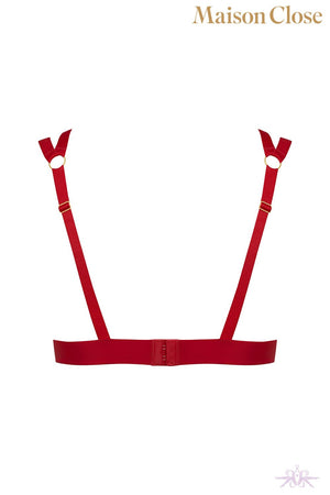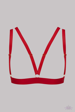 A stunning and seductive cupless bra from the Tapage Nocturne collection at Maison Close. This non-wired open triangle bra creates a harness look which frames the breast so well. It is finished with gold tone hardware.
