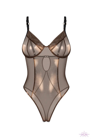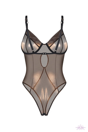 Embrace your boldest self in the Obsessive Soranna Open Bodysuit, where daring design meets undeniable allure. Crafted from luxurious mesh with a captivating golden shimmer, this piece clings to your curves with sensual confidence. The structured underwire cups lift and enhance your silhouette, while sheer panelling celebrates your femininity. The provocative open crotch design adds an unmistakable edge, making this the ultimate choice for nights when you want to feel utterly irresistible and unapologetically sexy.