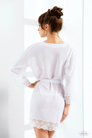 Cassidy is a beautiful, mid-length robe made from soft and transparent chiffon. The collar of the robe is edged with gorgeous black lace, as so with the cuffs and the hem. A chiffon waist tie is also included. Matching chemise and thong are also available.