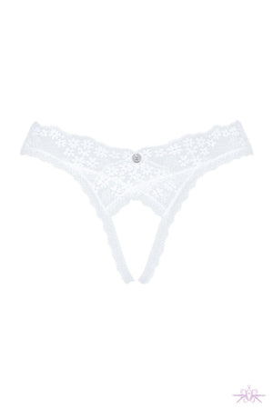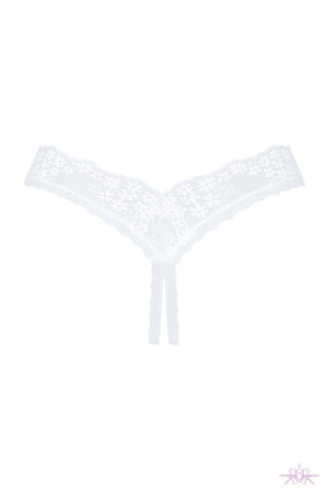 A seductive open cut thong from Obsessive. The delicate white lace thong is crotchless to add excitement. It has a beautiful feminine cut which enhances the buttocks.