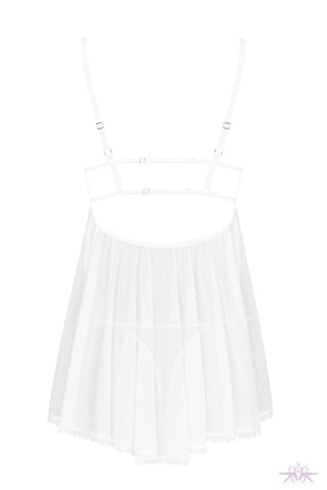 Sheer white babydoll and thong from the Heavenlly collection at Obsessive. Transluscent flowing fabric and beautiful floral lace nicely accentuates the bust whilst the tempting cut sensually reveals the back.