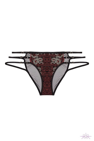 A bold brief from the Dakota collection at Playful Promises. This gorgeous little brief is in autumnal colours with snake embroidery over black mesh and glistening gold and red embroidered florals. There are three elastic straps to each side that are adjustable. Matching basque is also available.