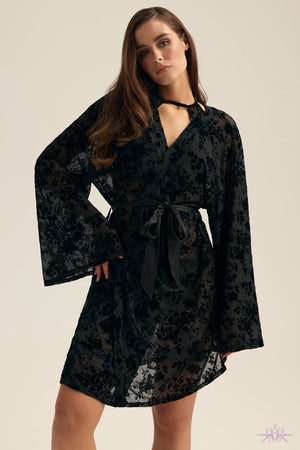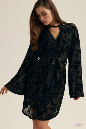 Embrace your seductive side with the Esotiq Black Floral Velor Dressing Gown. Crafted from sheer fabric with a soft velvety floral motif, it elegantly caresses your curves while wide, flowing sleeves add an air of drama. The adjustable waist belt lets you reveal just the right amount, making every moment irresistibly enticing. This gown transforms your intimate evenings into luxurious experiences filled with mystery and allure.