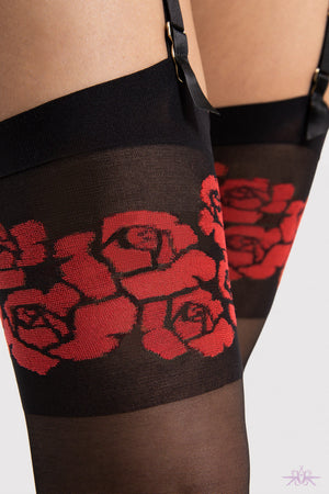 A sensual pair of stockings in fiery red and black that will surely excite the senses. The red flowers adorn the top of the thigh with a 20 denier sheer black leg.