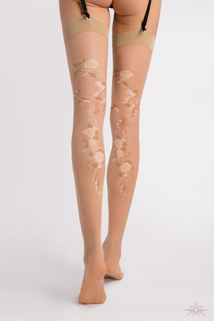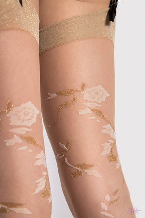 Nude stockings that will turn heads from Fiore. These have a glittering floral pattern to the rear and welt in golden lurex. The thread adds shine to the stockings which will add sparkle to your outfit.
