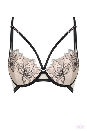 A gorgeous nude padded push up bra from the Prelude collection at Jolidon. This nude satin bra is overlaid with sheer floral mesh lace with delicate scalloped edging. The skin coloured mesh is entwined with black and gold lurex thread for a glamorous look. Multiple black satin straps feature to the front of the bra and follow the line of the bust to enhance your décolleté and the glamorous gold ring details and metallic bead embellishments complete the look of this bra. Adjustable straps and hook and eye fastening to the rear. Matching items are also available.