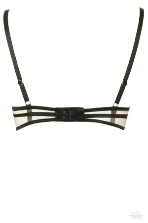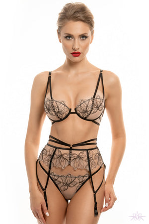 A seductive underwired sheer mesh bra from the Prelude collection at Jolidon. This nude satin bra is overlaid with sheer floral mesh lace with delicate scalloped edging. The skin coloured mesh is entwined with black and gold lurex thread for a glamorous look. Glamorous metallic bead embellishments sit across the front of the bust and there are adjustable straps and hook and eye fastening to the rear. Matching items are also available.