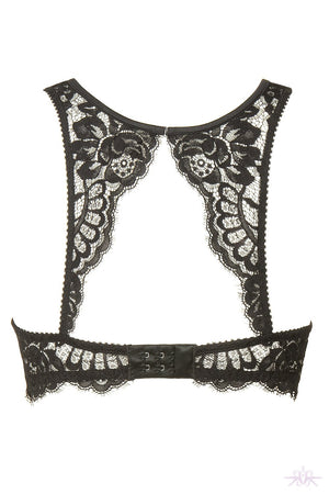 An alluring bra in lace and tulle from the Marlene collection at Prelude Milano. This satin edge underwired bra is truly stunning with the sheer section covering yet enhancing the bust. The triangular section of lace that surrounds the breasts adds a gorgeous feminine accent and the black Swarovski crystals in the centre add sparkle. The back of the bra has two vertical lace straps which are connected at the top. The bra is fastened by way of a hook and eye.