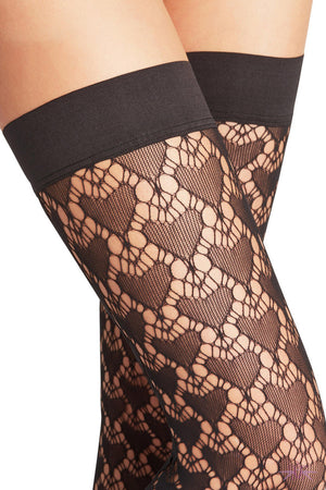 A beautiful hold up with love from Falke. These are made from a high quality Raschel knit which is gorgeous. They are so soft and comfortable to wear and are durable. Delicate hearts cover the leg with fishnet intertwined. They are held in place by a plain stay up band.