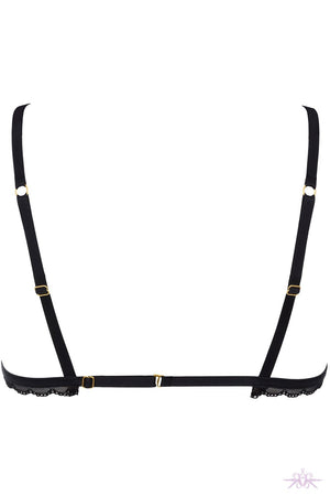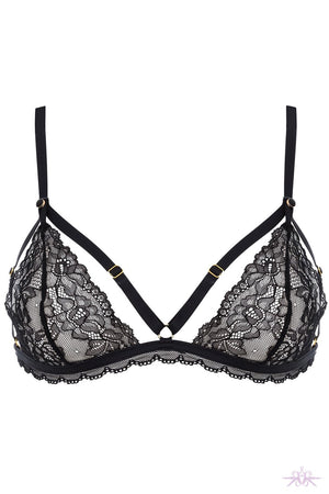 A glamorous triangle bra from the Le Petit Secret range at Maison Close. This bra has delicate lace detail and is openable at the bust with buttons. It features a hook closure at the back with adjustable straps.