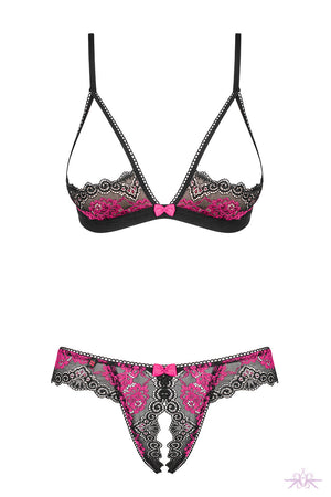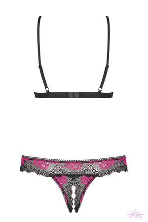 Indulge in subtle temptation with the Tulia crotchless set from Obsessive. This charming set is lace and has a rosy design and boasts a cupless bra which exposes the bust and a daring open pant.