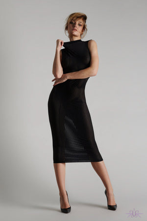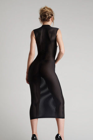 This gorgeous sleeveless dress a new edition to the Bande à Part collection at Maison Close. This piece is designed with graphic lines which slim and lengthen the body and is semi-sheer in appearance with soft tulle and microfibre fabric. The high neck on this sleeveless dress and the semi sheer fabric make this a captivating piece, with a figure flattering cut that encapsulates the feminine form to the greatest effect. Matching items also available.