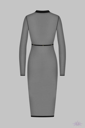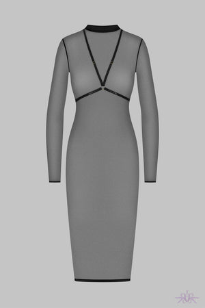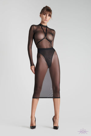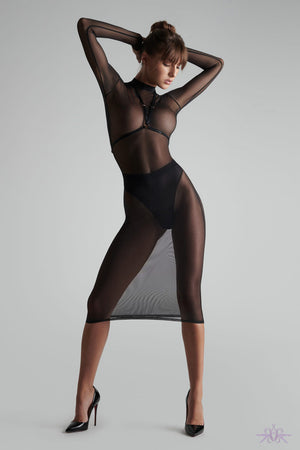 A gorgeous midi dress from the Corps a Corps collection at Maison Close. This decadent design has long sleeves in black and features soft mesh with a sheer iridescent appearance.